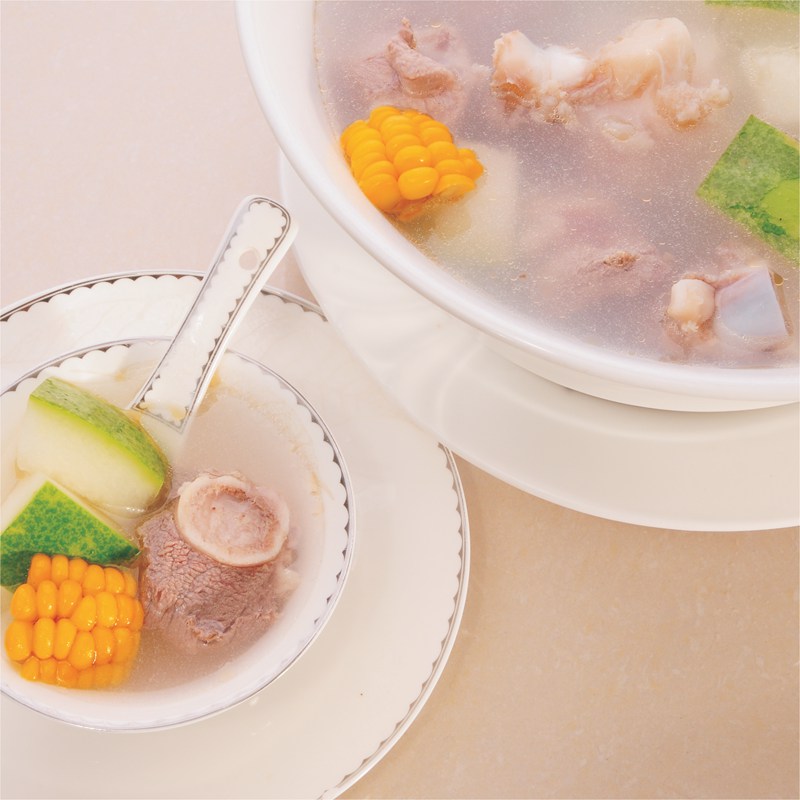 2冬瓜、棒子骨飛水乳,入沙煲,放入姜蔥